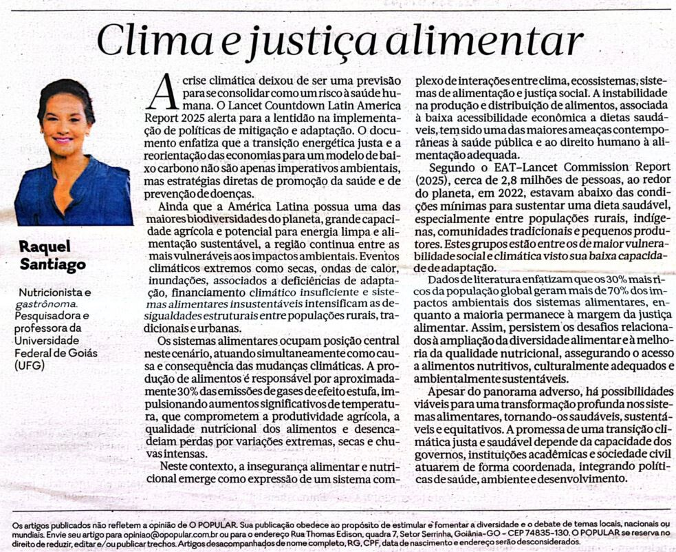 Artigo 'Clima e Justiça Alimentar' da Professora Raquel Santiago, da UFG, em destaque no jornal O Popular.